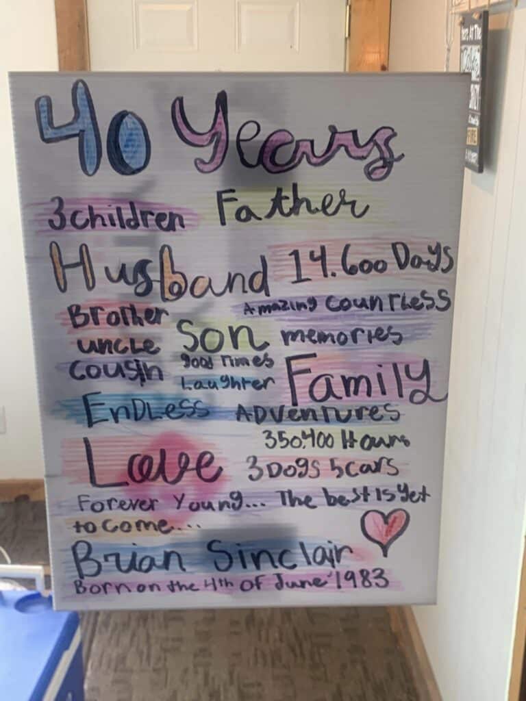 Another sign made by the kids showing all of Brian’s stats aka achievements over the last 40 years!