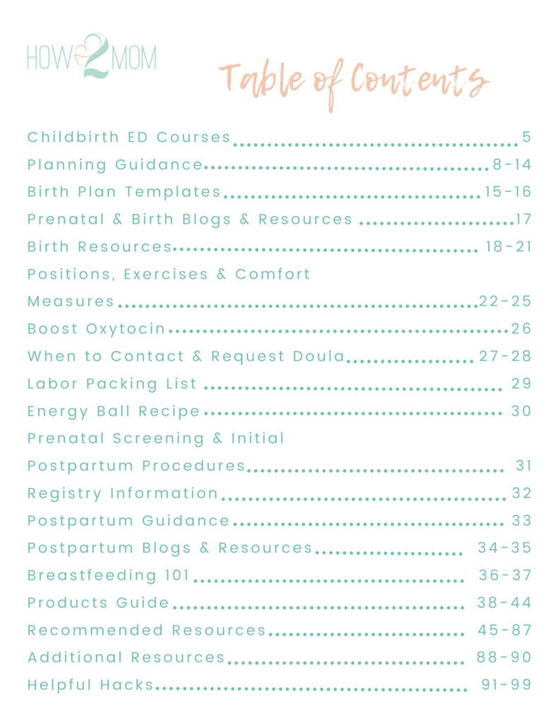 But back to the reason why you are here! One of our biggest perks for our clients is An exclusive and comprehensive Client Packet, including resources and direct links for everything you need to prepare to birth and bring your baby home! Because this packet is exclusive, we don’t want to share too much but take a look below to see the Table of Contents!