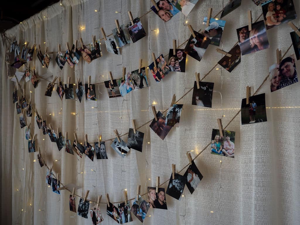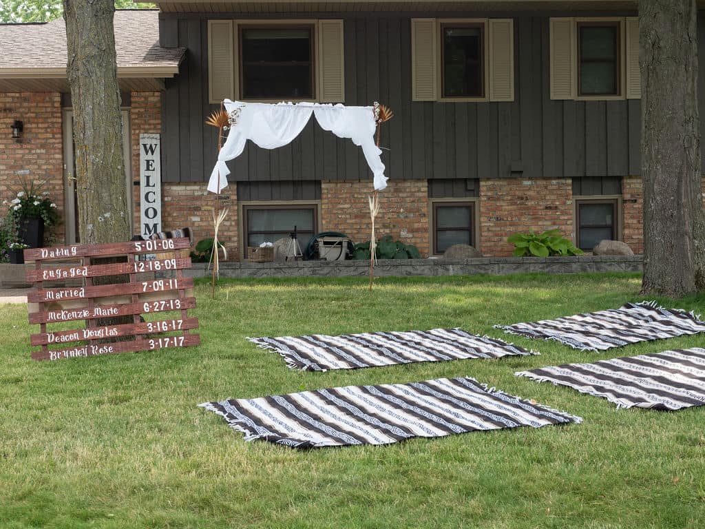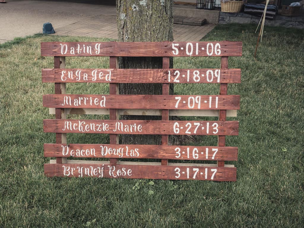 Our friend, Jaime from Jaime Hendrix Photography took all these amazing photos! My girlfriend, Lindsey helped me dream up the vision and then Kassie and I set up the ceremony area in our front yard and we used our leftover ceremony program fans from our wedding! But my favorite details were the DIY ones, this pallet with all the important dates from our life together and the photo wall of pictures from the last 15 years together!